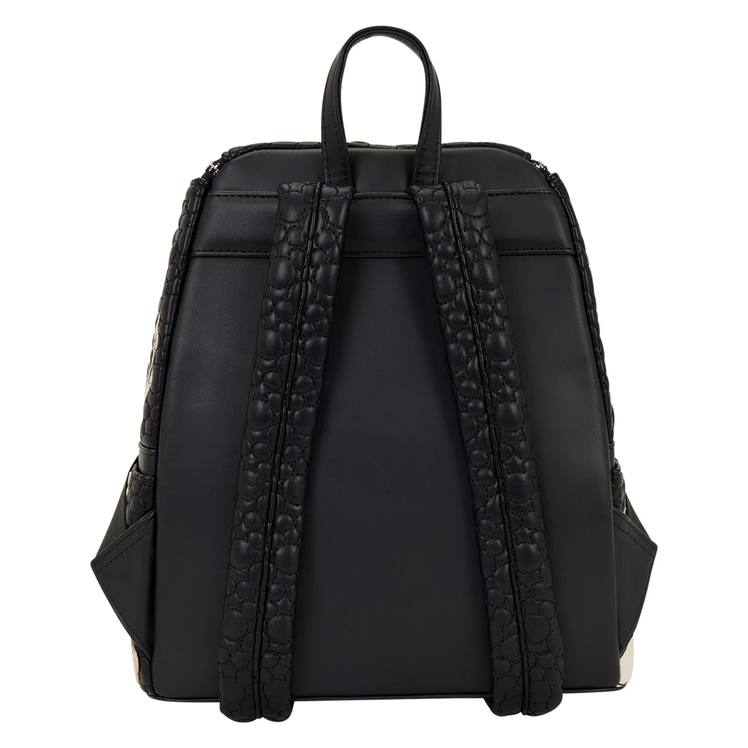 This mini backpack features Mickey & Friends “sketched” on the bag against a quilted Mickey-silhouette background. You’ll find Mickey on the front pocket while Minnie, Pluto, Goofy, and Donald are on the side pockets! On the top flap of the bag, you’ll find a metal charm in the shape of a Mickey head surrounded on either side by embroidered leaves and flowers!
