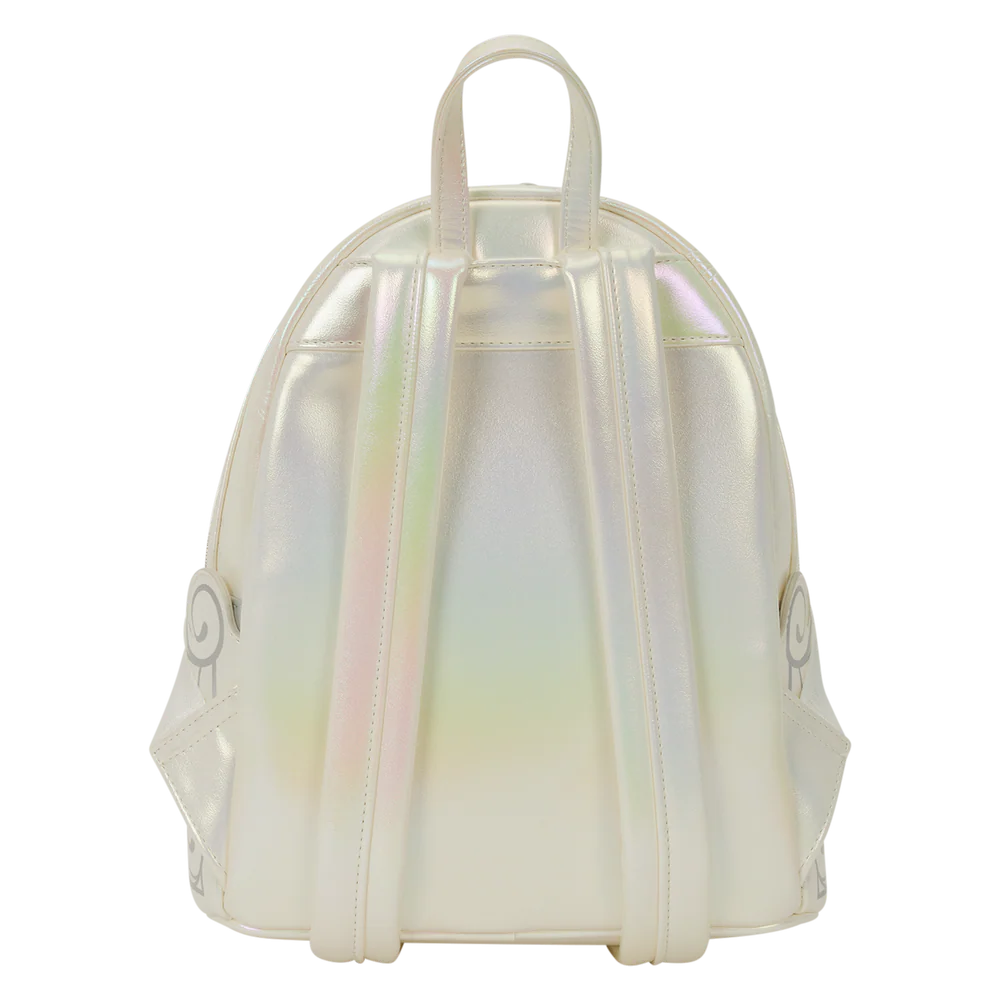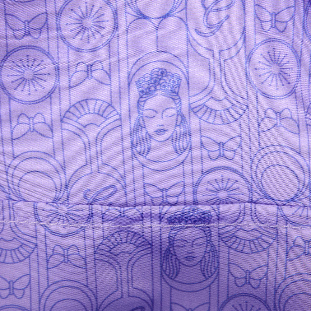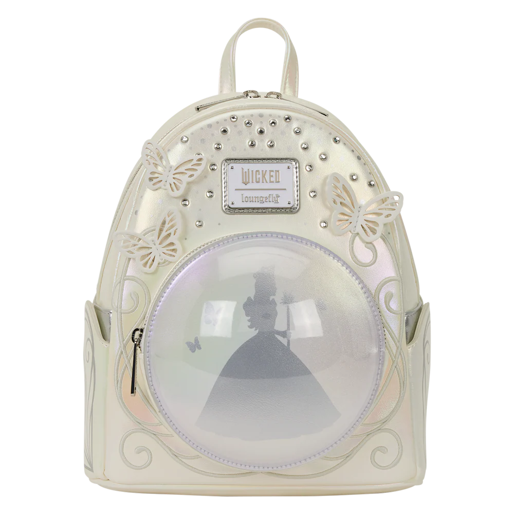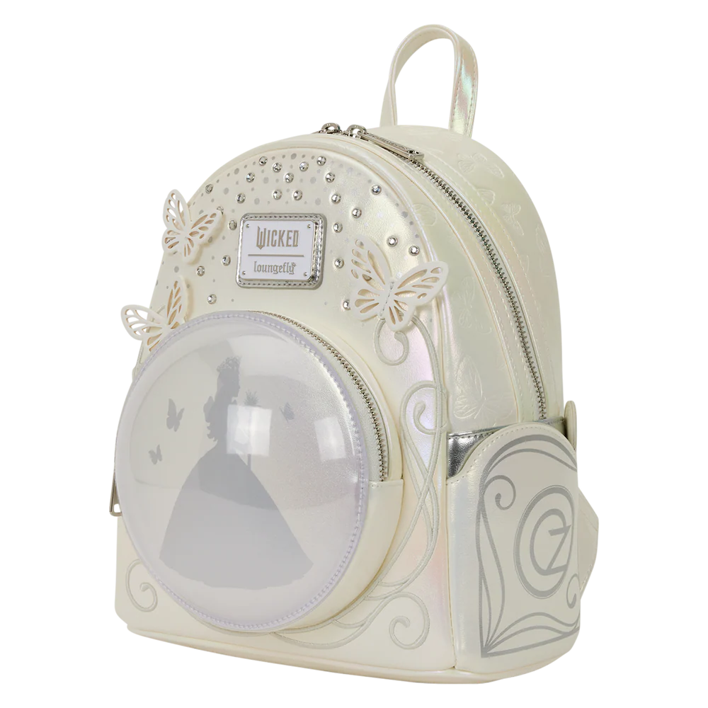 This gorgeous mini backpack features pearlescent faux leather with elegant details, including silver foil, rhinestones, and raised tonal embroidery. Over the front pocket, you’ll find a clear PVC bubble with Glinda inside it! Butterflies and swirling designs cover the bag.