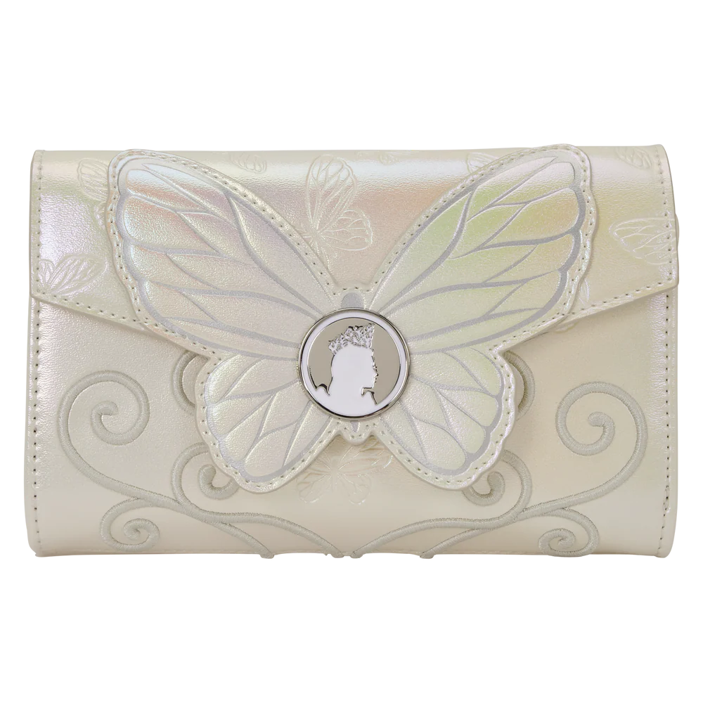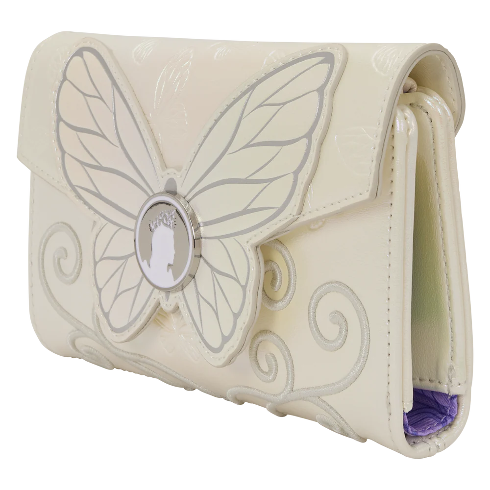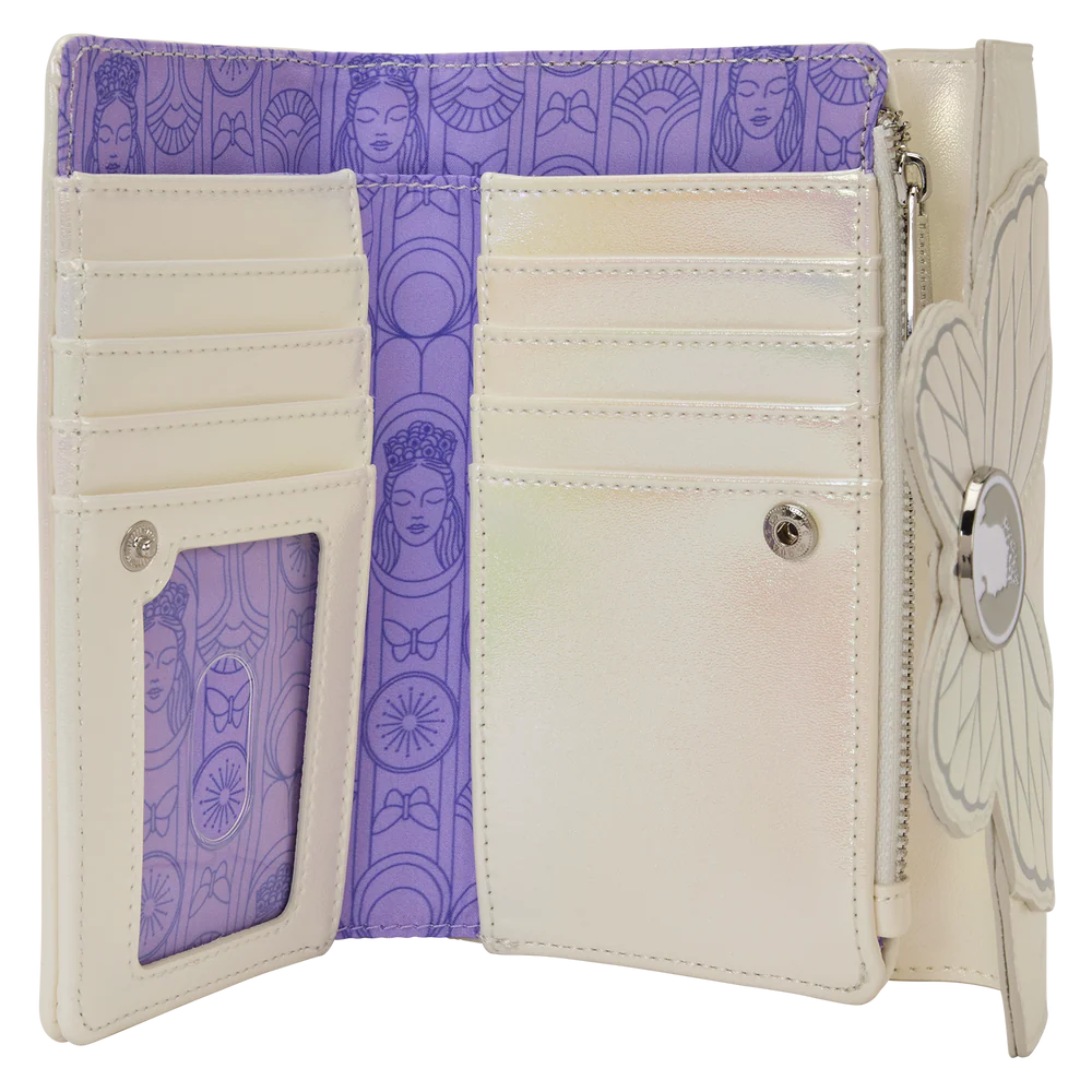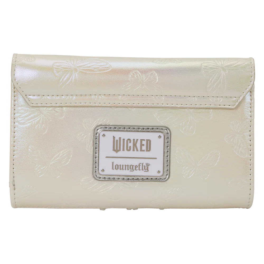 This gorgeous wallet is pearlescent with debossed butterflies and raised tonal embroidery of elegant swirls. On the front, you’ll find a large butterfly with an enamel charm that has Glinda’s silhouette within it! Open it up to find seven card slots and one clear ID slot. It’s the perfect accessory to show off your love for all things Wicked.